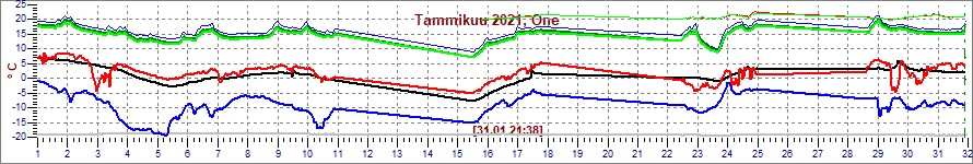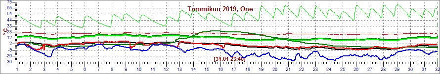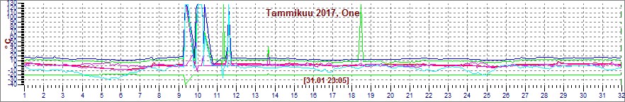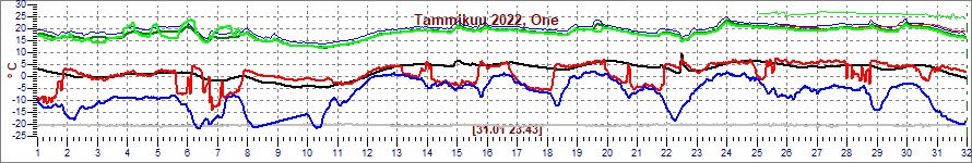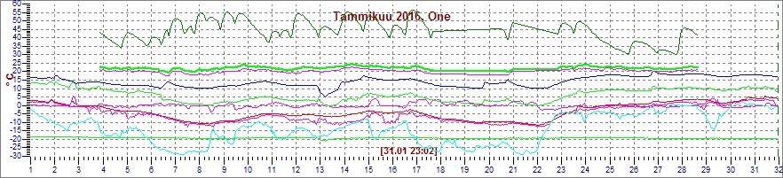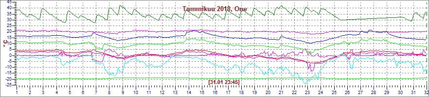 käyrillä näkyy ulkolämpö, pakastin, halli, harrastenurkka, sisälämpötila, pikakompostori ja takanpäältä.